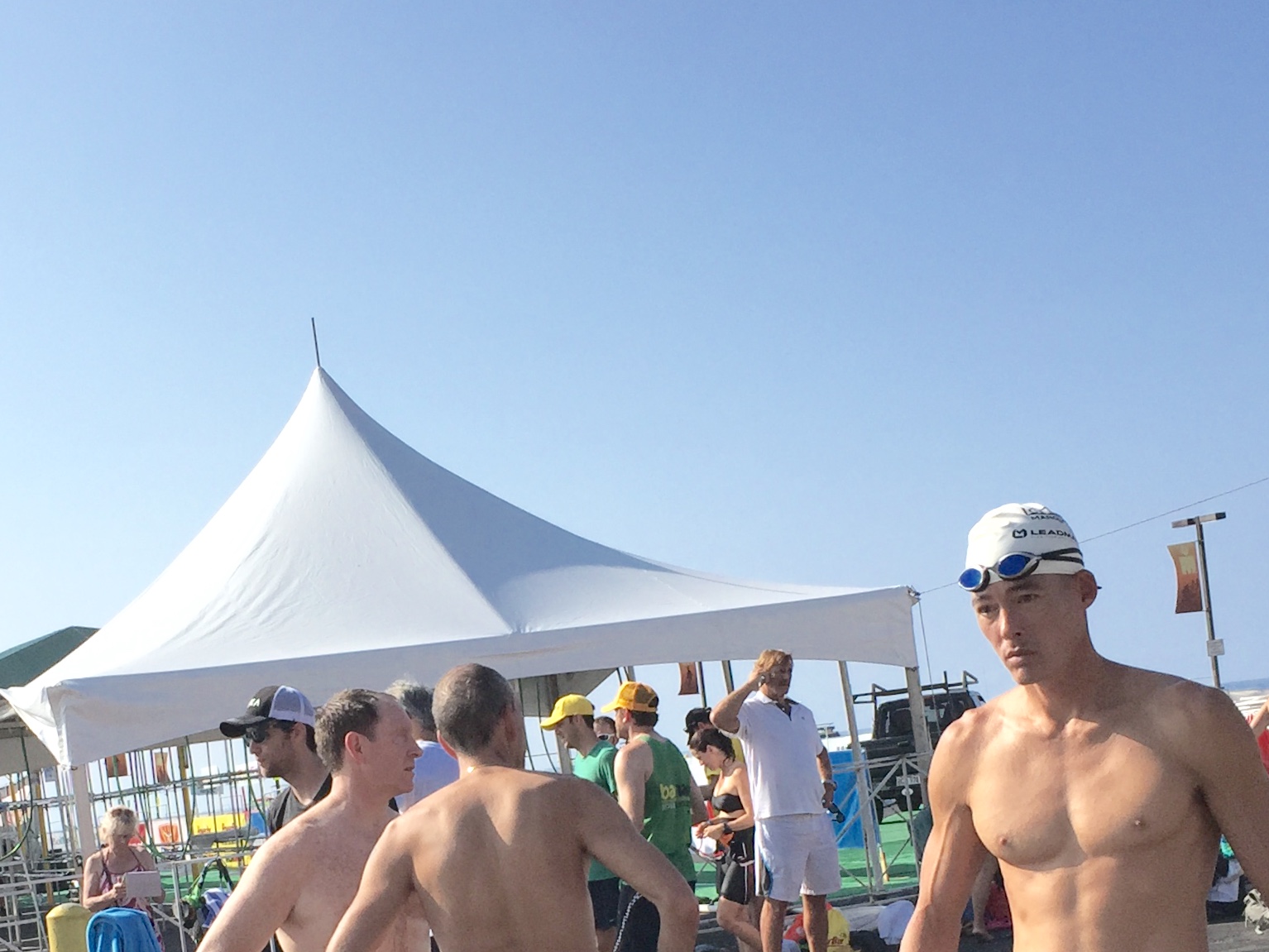 It wasn’t too long before I reached the pier. I could hear Mike Riley’s voice. I was so close. When I finally stood up, with my feet planted firmly in the sand, I ascended the stairs and saw the clock: 1:08. That was a BIG swim time. (A bit bigger than I’d expected). I was expecting to see 1:02-1:04. Fortunately, I hadn’t any time goals. Just finish. Minimize contact. That was it.