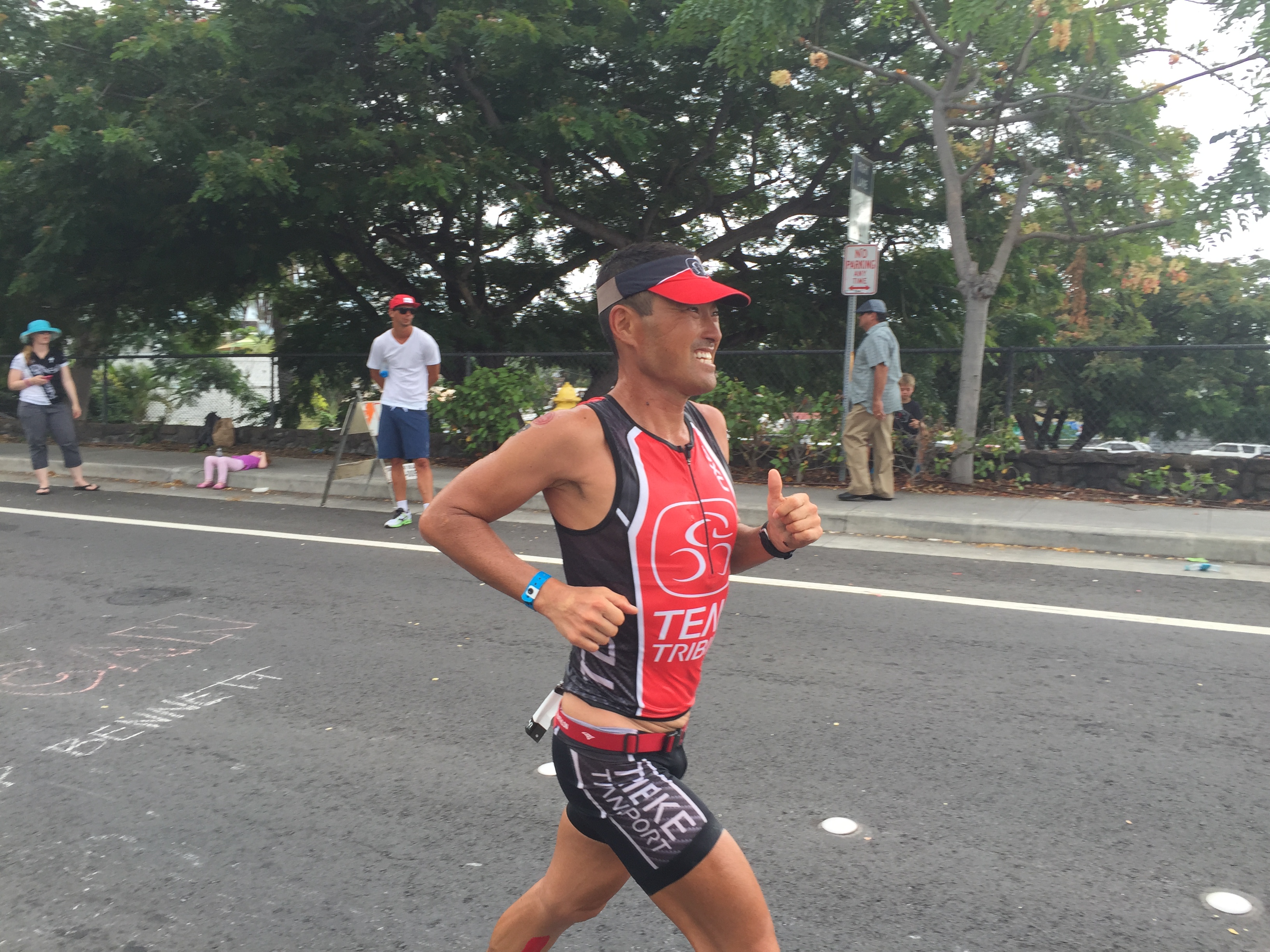 By mile 4 along Ali’i Drive, the negative voices were silenced, and I was feeling great! I saw Marc, Angela, Taylor, and Briana at the TBT tent, and I saw three of my teammates pass me on the way back into town.