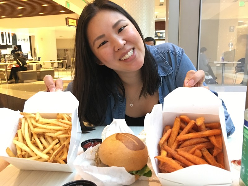 However, this year we were given a $30 food voucher by our airline, Air China, because our flight was delayed by two hours. (Fortunately, I already knew our flight was delayed, as I checked the airline’s website the night before, and I’d reconfirmed by phone in the morning. Thus, we weren’t inconvenienced nor surprised by the delay. Of course, we still eagerly accepted the $30 food voucher.) We went to the food court in the Tom Bradley Terminal and enjoyed an Umami Burger! (and fries, and sweet potato fries, and a smoothie).