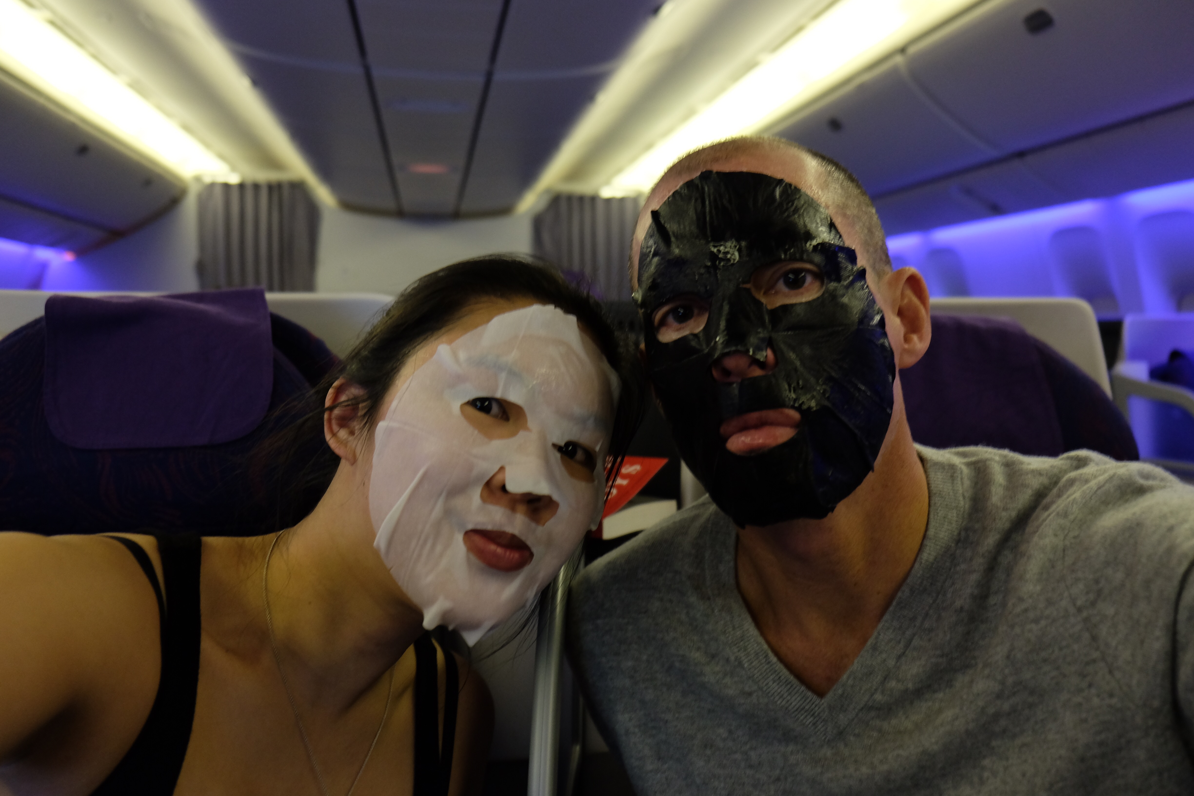 At some point during the flight, Michelle explained to me that we should not risk facial dehydration. I didn’t quite understand what that meant, but she proceeded to remove two hydration masks from her purse, which were then applied for ten minutes.
