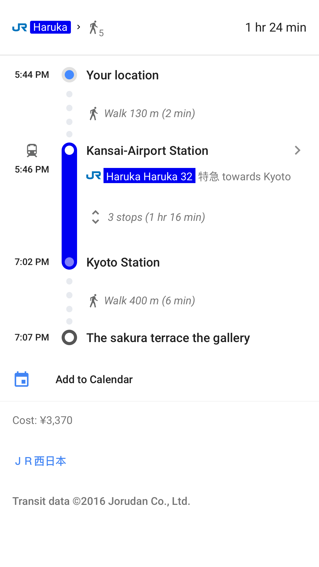 We went to the JR ticketing area, and there was no line. The woman at the counter spoke great English, and she efficiently provided us with two tickets (we asked for reserved seats) to Kyoto Station (approximately 1 hour 24 minutes by train—as per Google Maps—from the airport).