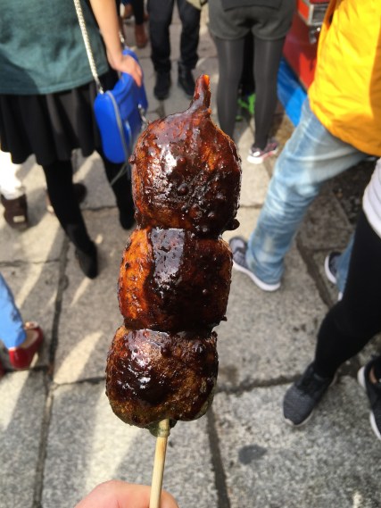 It’s a bit like mochi on a stick, swathed in a syrup made from soy sauce and sugar.
