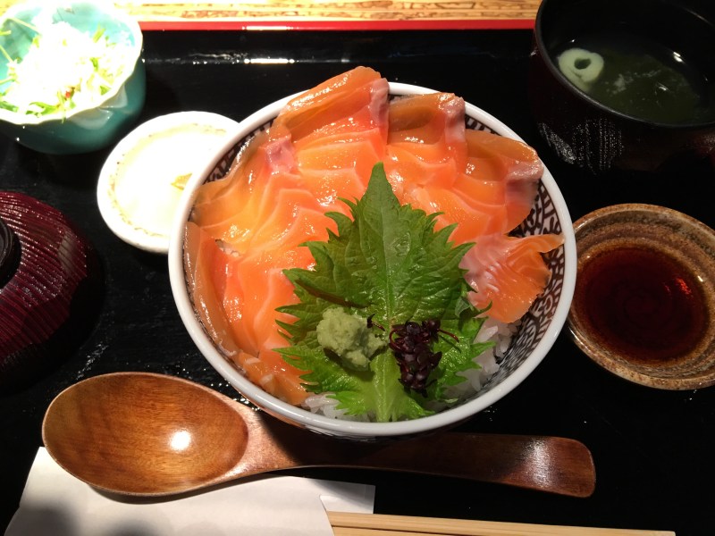 It should be noted that the US dollar currently yields quite a lot in Japan. When I first visited Japan in 2003, I remember marveling at how expensive everything was. But things are quite a bit different now. Here’s some salmon donburi (salmon over rice) that Michelle and I enjoyed. We each ordered our own bowl, which came with tea and miso soup. ($18.66 total!!) Go to Japan now!