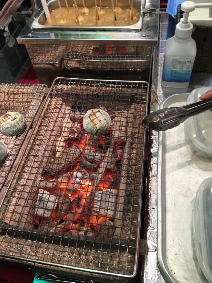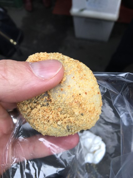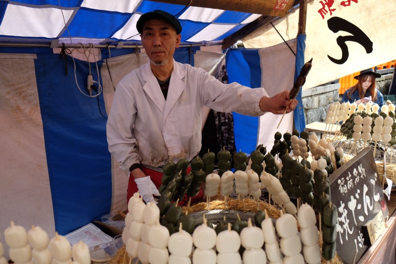 I can develop ravenous hunger after looking at shrines, so we enjoyed a snack. First we had a Dango kebab (Kushi dango).