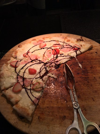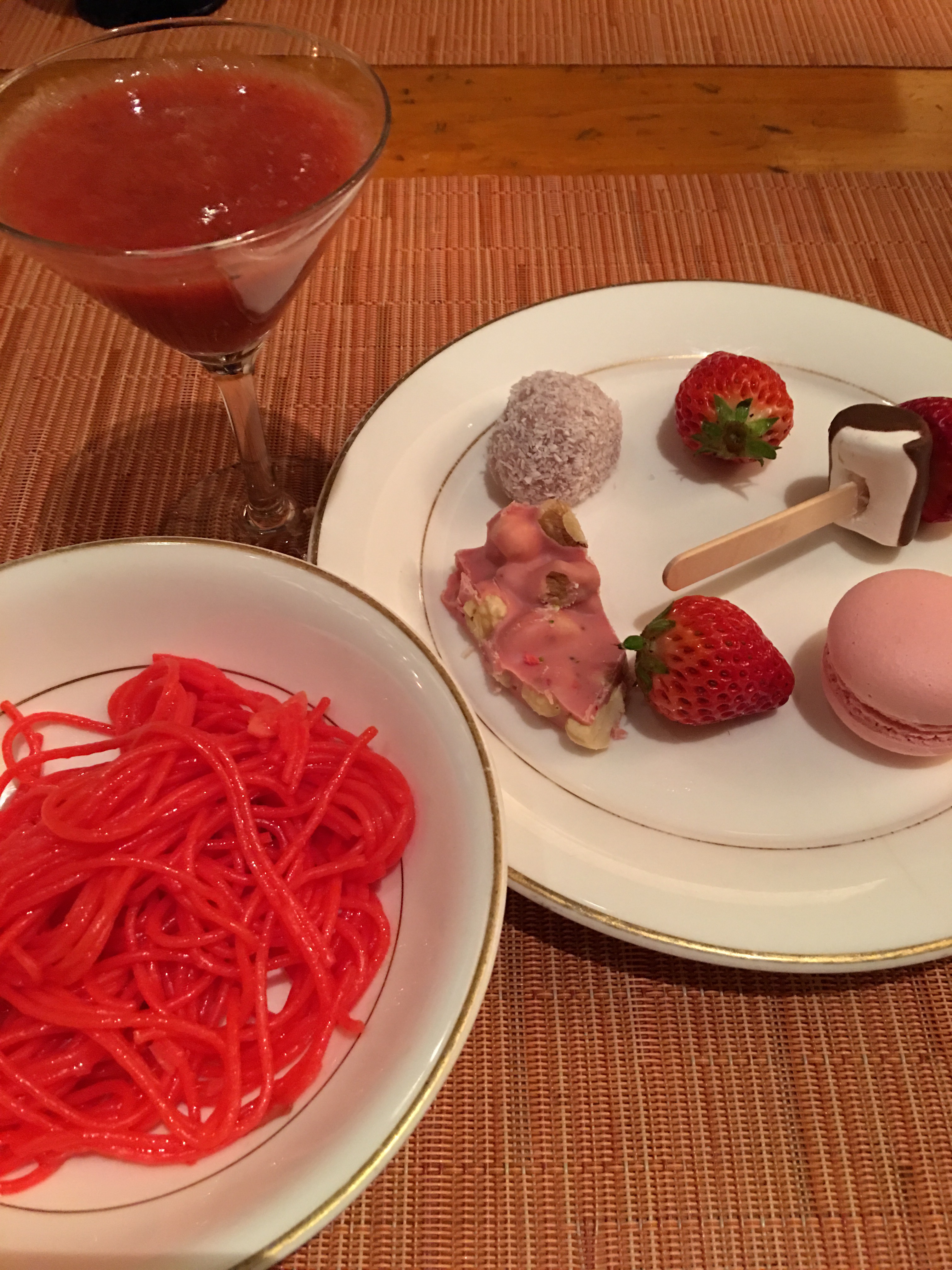 This time—at the Strawberry Buffet—would be different, as I vowed to pace myself, and to mix it up. Sure, we had the strawberry marshmallow kebab, the cream puff, the macaroon . . . but we also had the strawberry spaghetti, the strawberry pizza, the strawberry calzone. Then there was the strawberry juice and a cappuccino (with no strawberry). I remained steady, balanced. If this were an episode of Man vs. Food, Adam would proudly declare that “Man won!”