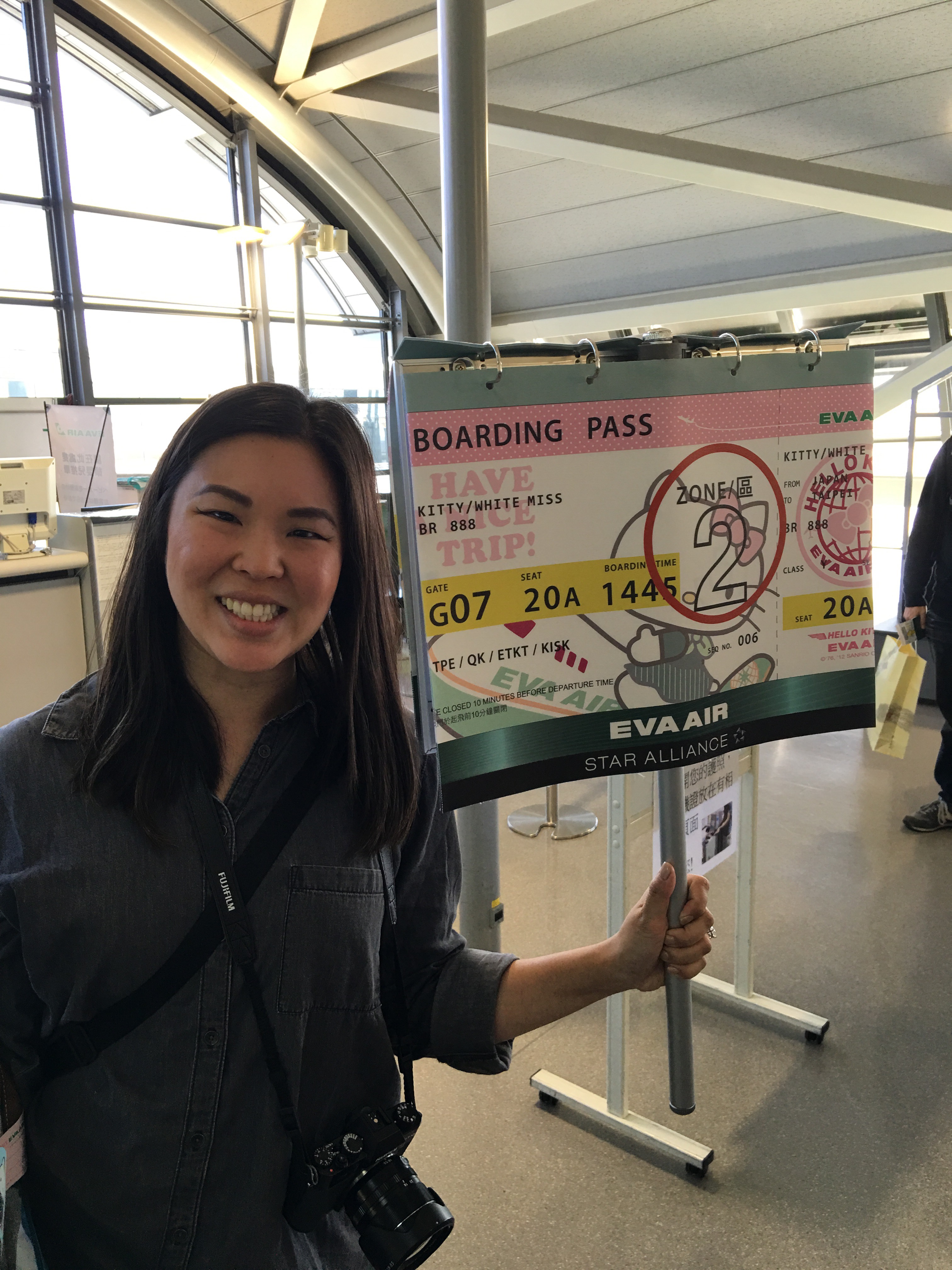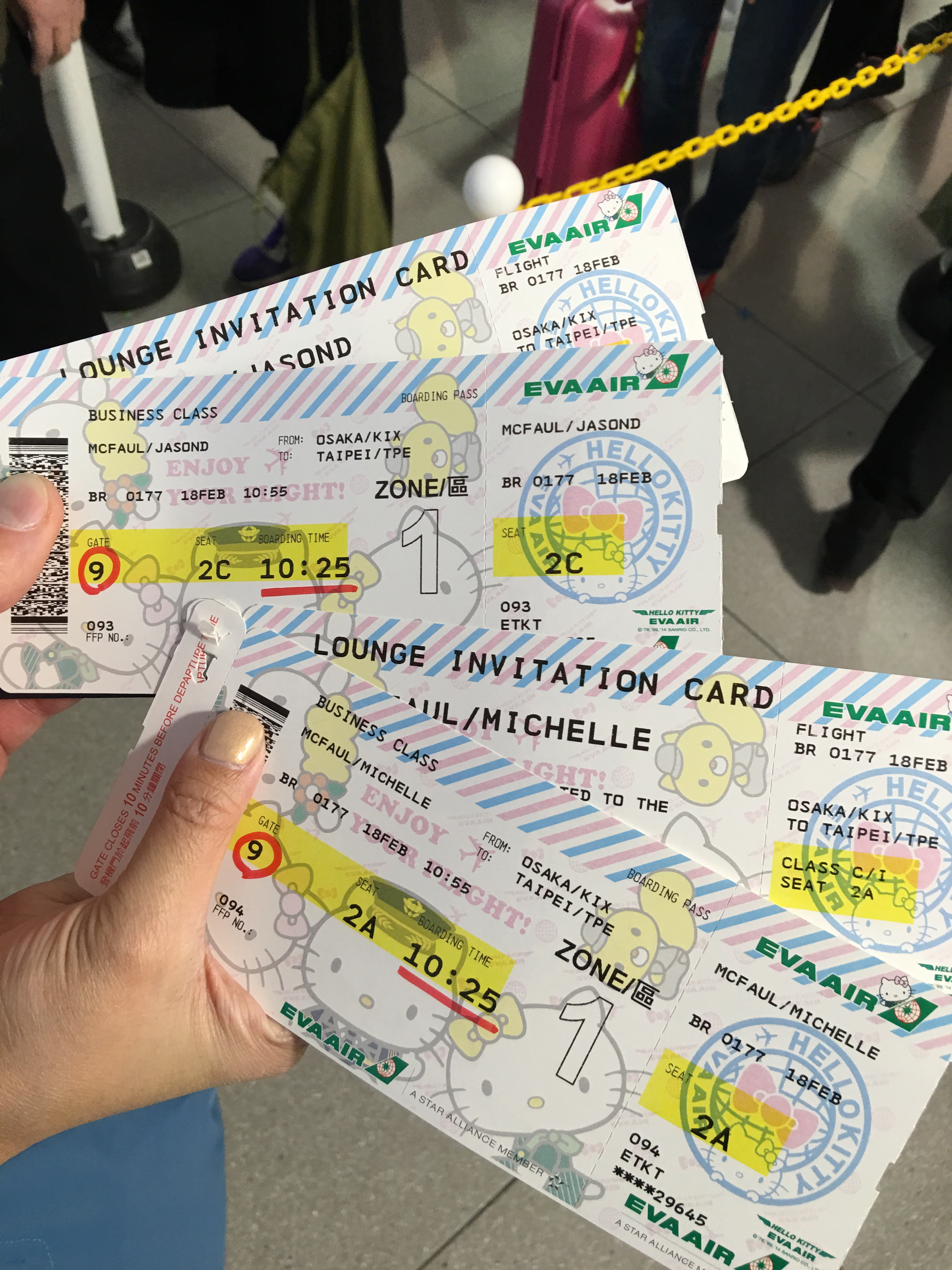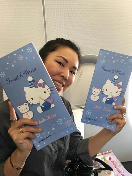 Departing Japan would typically sadden us. But today marked a special occasion. See, Michelle began her love affair with Hello Kitty at birth, so when I told her about the Hello Kitty Jet operated by EVA, it was a coup de foudre. It was, as they say, a lightning strike; when Michelle saw photos of that Hello Kitty emblazoned Airbus A300-200, complete with a similarly-themed luggage trolley and boarding pass, her jaw dropped.