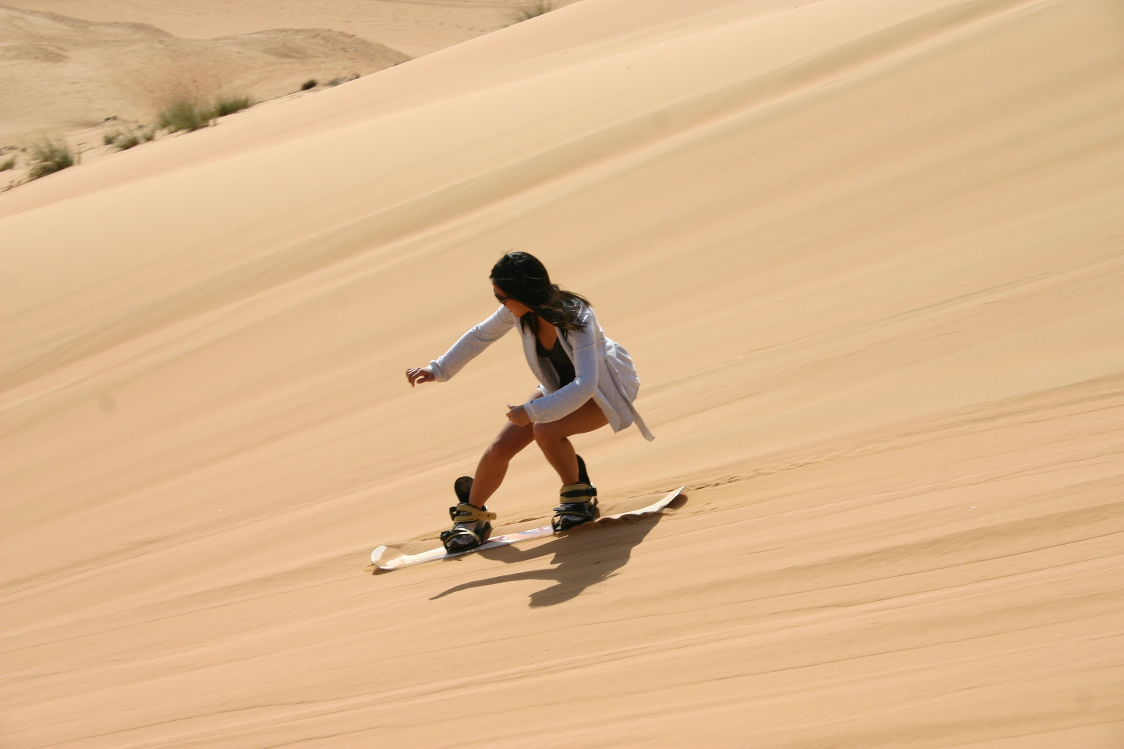 1.  Just as some nations protect rain forests, Dubai, UAE protects its ever-decreasing deserts. Sand-boarding, as Michelle is doing below, is a thrilling way to see the majestic sand dunes that once characterized the southeast coast of the Persian Gulf.