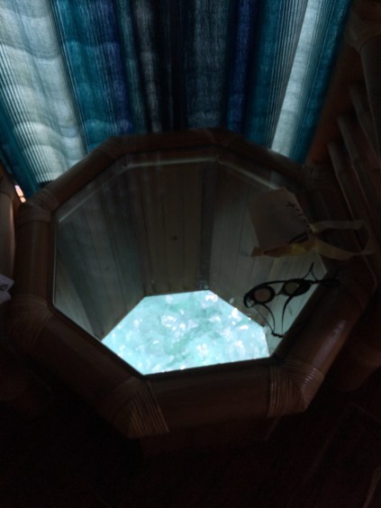 Each bungalow has a glass-topped coffee table whose bottom is missing, providing guests with a view of fish and . . .